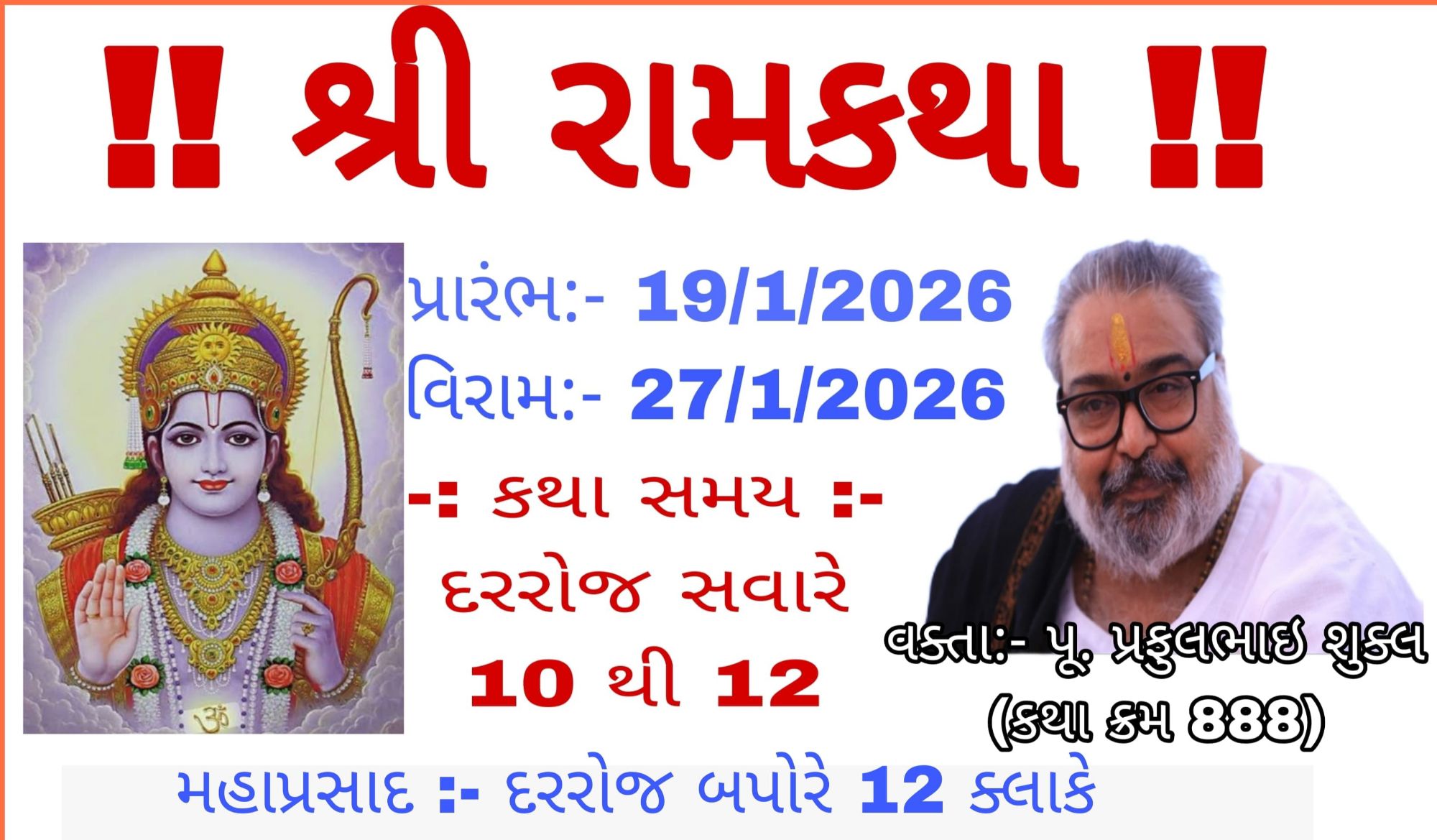 આ રામકથાના વક્તા તરીકે પૂજ્ય પ્રફુલભાઈ શુકલા દ્વારા શ્રીરામના આદર્શ જીવન, ધર્મ, ભક્તિ અને સંસ્કારના મૂલ્યોનું સુંદર વર્ણન કરવામાં આવશે. તેમની વાણી દ્વારા રામકથાના પ્રસંગો જીવંત બની શ્રોતાઓને આત્મિક શાંતિ અને જીવન માટે પ્રેરણા આપશે.