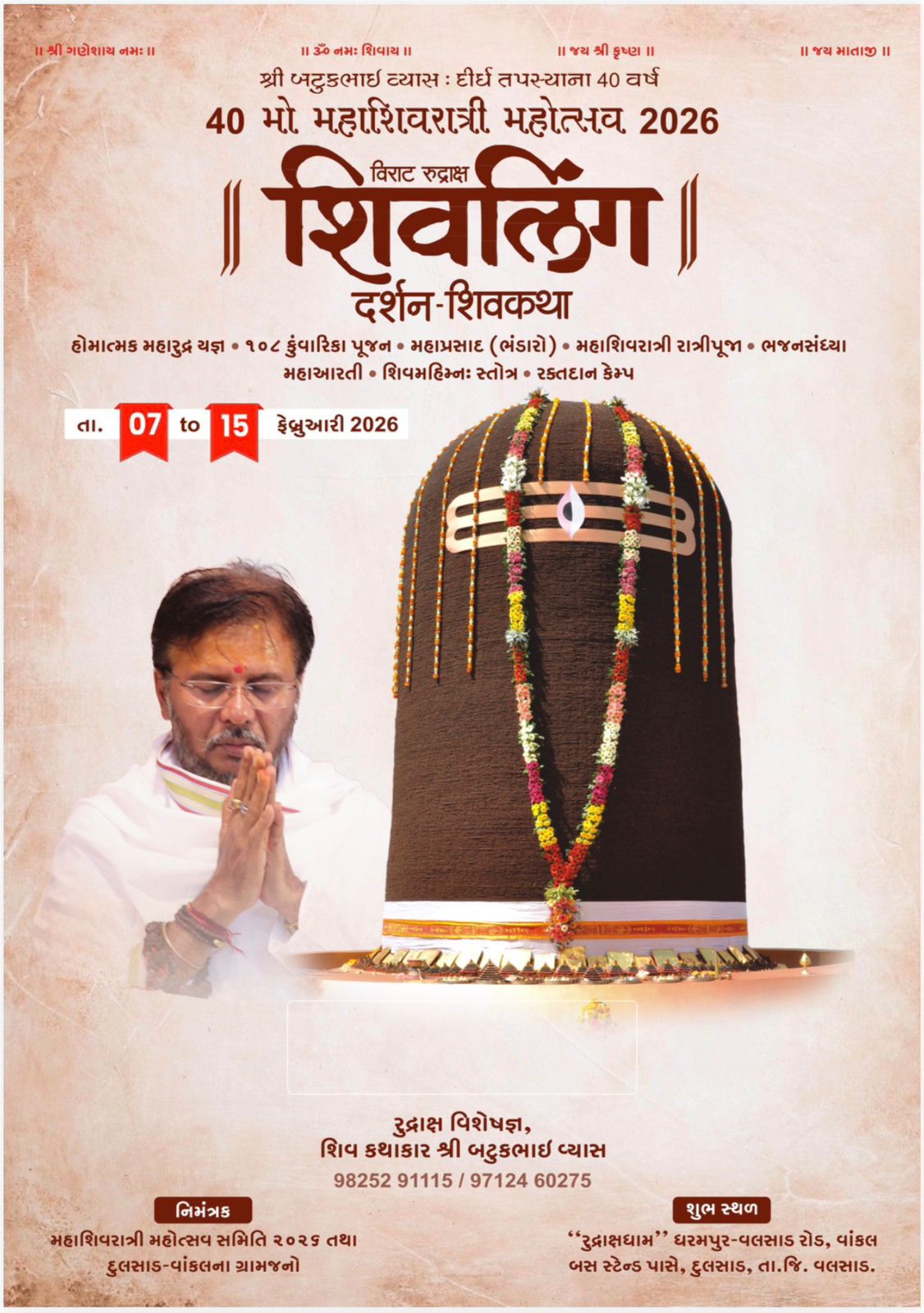 ભગવાન આસુતોષ મહાદેવજી અને માઁ જગદંબાની અસીમ કૃપાથી પૂજ્ય બટુકભાઈ વ્યાસની દીર્ઘ તપસ્યાના ૪૦ વર્ષ પૂર્ણ થવાના આ પાવન પ્રસંગે વાંકલ ખાતે આયોજિત મહાશિવરાત્રિ મહોત્સવ ભક્તિ, આસ્થા, સંસ્કાર અને સેવાનો મહાન સંગમ બનશે. આયોજક સમિતિ દ્વારા સર્વ શિવભક્તોને પરિવાર સહીત આ દિવ્ય પ્રસંગે ઉપસ્થિત રહી પુણ્યલાભ લેવા ભાવભર્યું આમંત્રણ પાઠવવામાં આવ્યું છે.